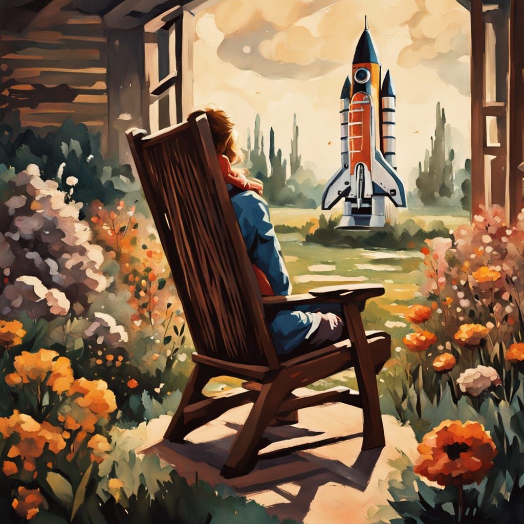 A serene scene of a woman sitting in a garden chair surrounded by vibrant flowers and a distant space rocket, captured in soft, impressionist brushstrokes with intricate textures and earthy tones.