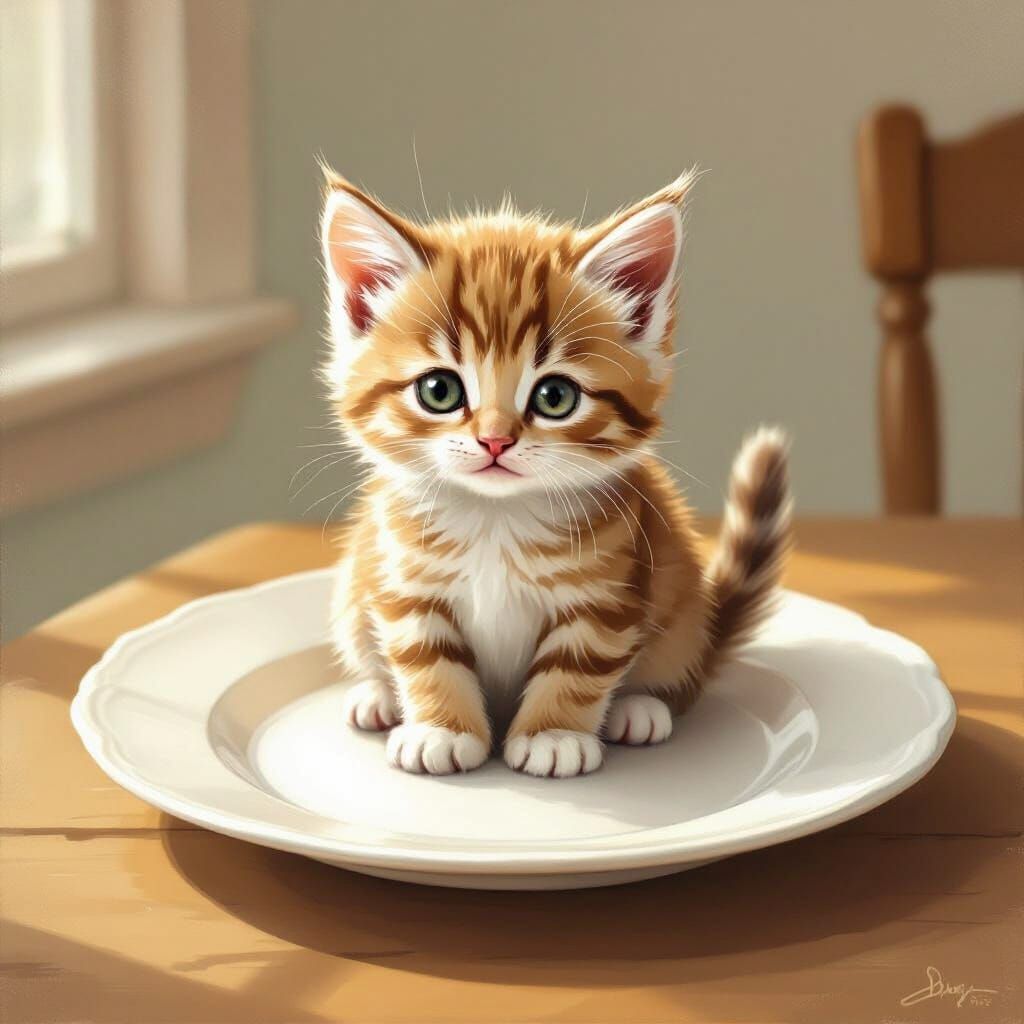 This charming illustration shows a cute, confused kitten seated on a white plate on a wooden table. Rendered with soft, warm light and vibrant details, it evokes a gentle, storybook aesthetic.