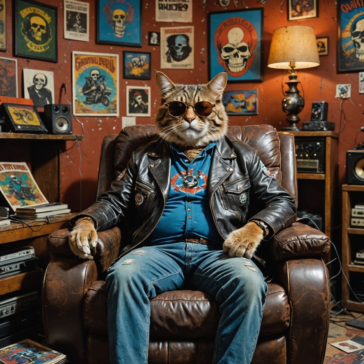 This image shows a cool, older cat in a leather jacket and sunglasses relaxing in his man cave. The room features Grateful Dead memorabilia and vintage stereo equipment.