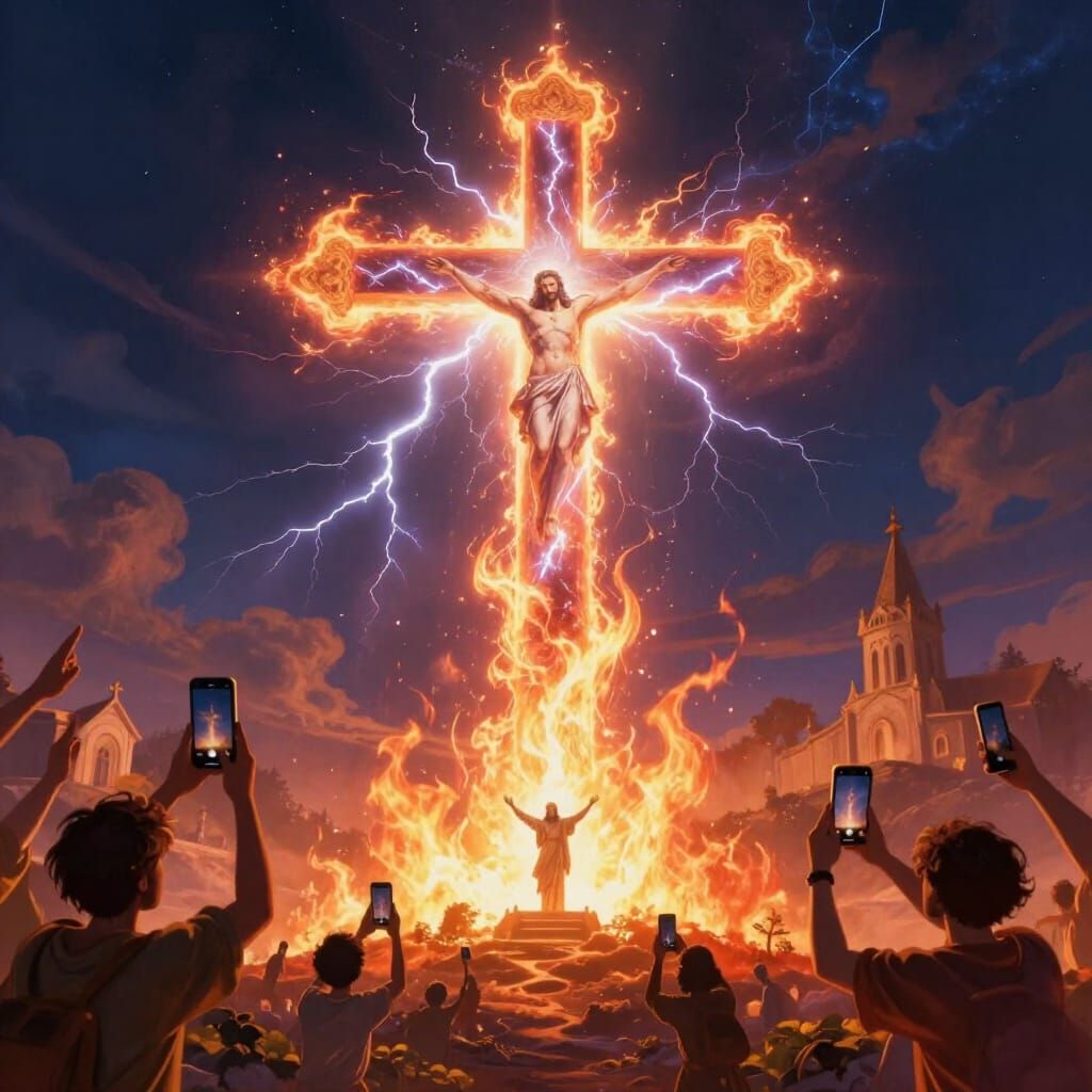 A striking digital painting shows a divine energy cross rising from earth, illuminated by celestial light and infernal flames. People summon it, and lightning strikes as it ascends, creating an awe-inspiring glow. Cinematic and dramatic.