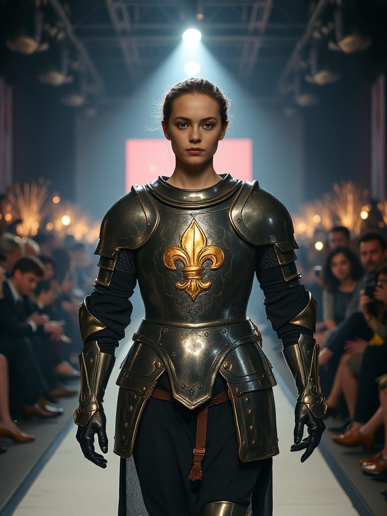 This image shows a confident young woman in intricately crafted 14th century French armor, adorned with a golden fleur-de-lis emblem, walking down a modern fashion runway under a soft spotlight with a moody, high-contrast atmosphere reminiscent of Syd Mead and Zdzisław Beksiński's styles.