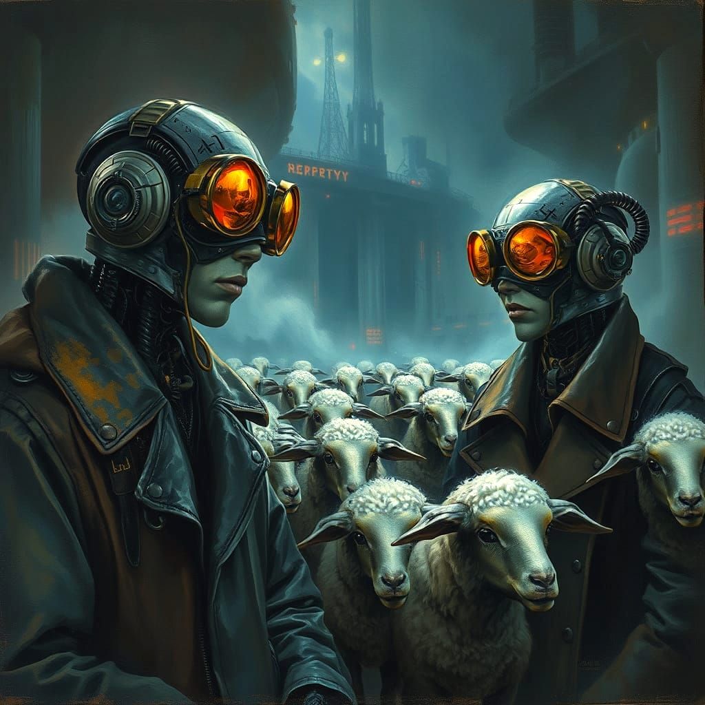 A surreal image of androids in a dreamlike state, rendered as a hyperdetailed charcoal drawing with steampunk elements. The artwork has the feel of an oil painting.