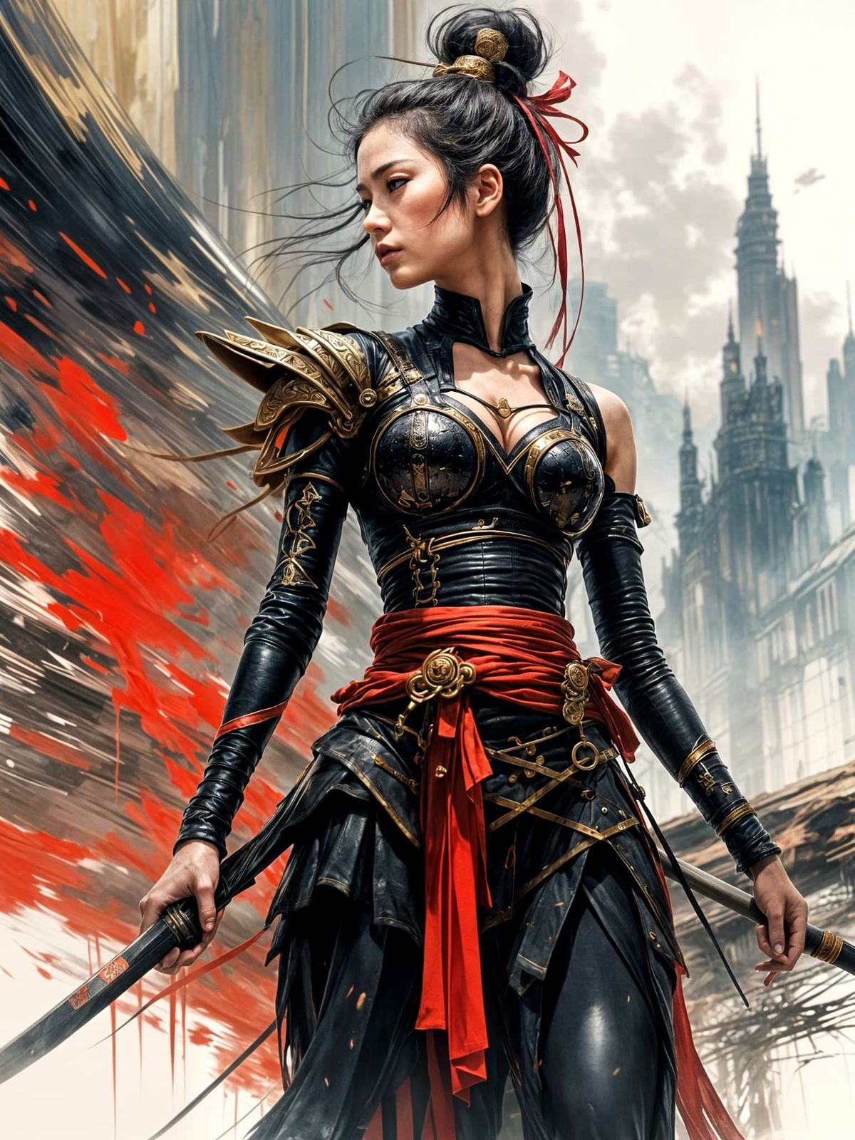 This image depicts a fierce Japanese warrior woman, prepared for combat and clad in a close-fitting outfit. The artwork has a vibrant, anime-inspired aesthetic.