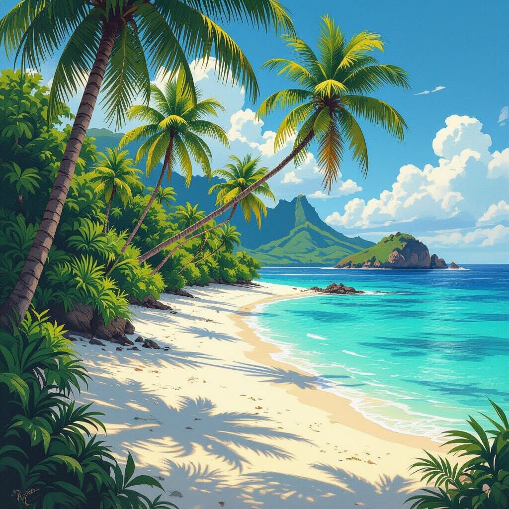 This image shows a tropical island paradise with pristine beaches and clear turquoise waters. The vibrant colors and detailed scenery evoke a blend of post-impressionist and fantastical styles.