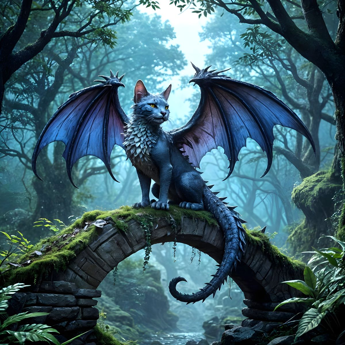 A realistic majestic, regal cat-dragon hybrid, 2 wings open, its scales shimmering with iridescent blues and purples, perches on a moss-covered, crumbling stone archway. Below, a dense, enchanted forest is shrouded in mist, with shafts of moonlight piercing the canopy. The creature possesses an air ...