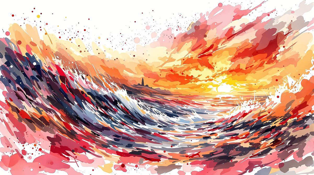 This dynamic watercolor artwork captures a chaotic coastal scene during an intense autumn sunset, featuring intricate patterns and a splash watercolor style with visible splatters and energetic drips.