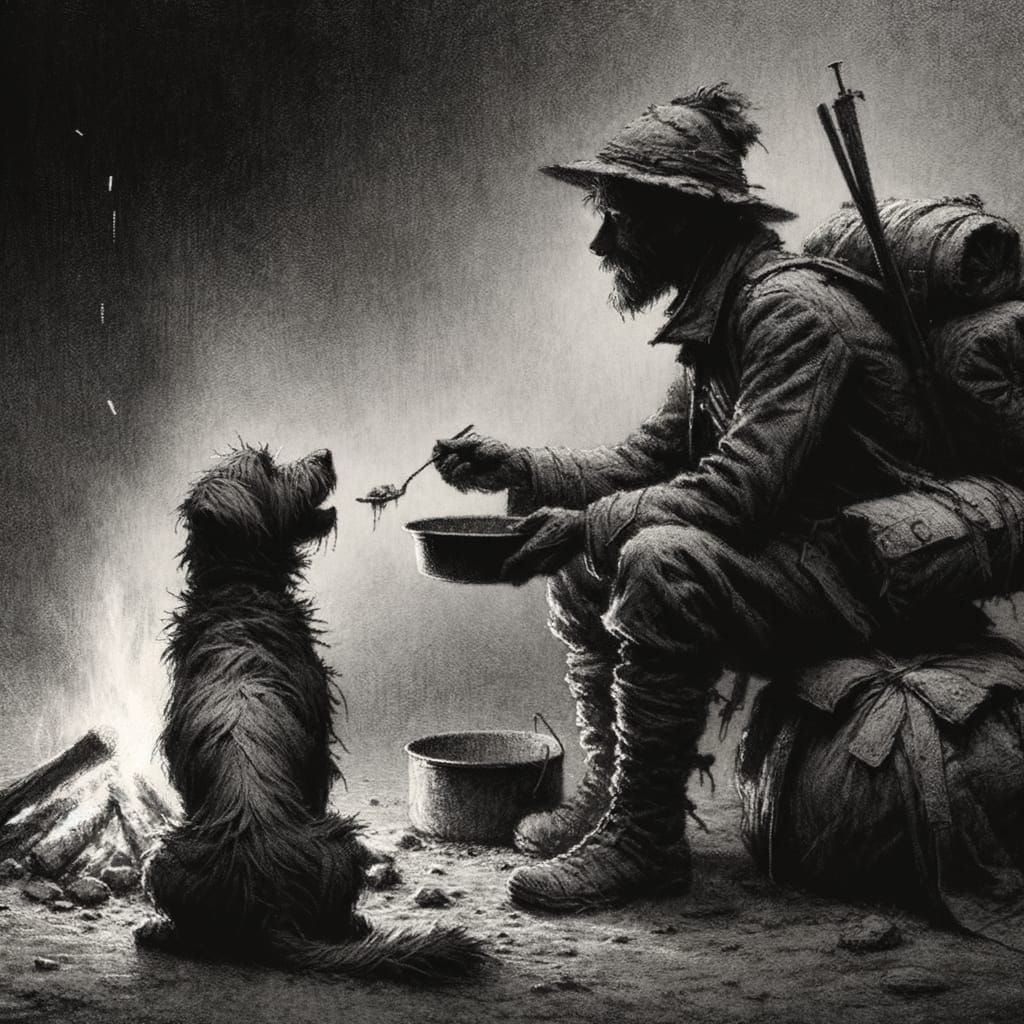 A battle-worn soldier and his dog share a meal by a campfire. Rendered in a monochromatic charcoal sketch style, the image captures quiet resilience and shared hardship.