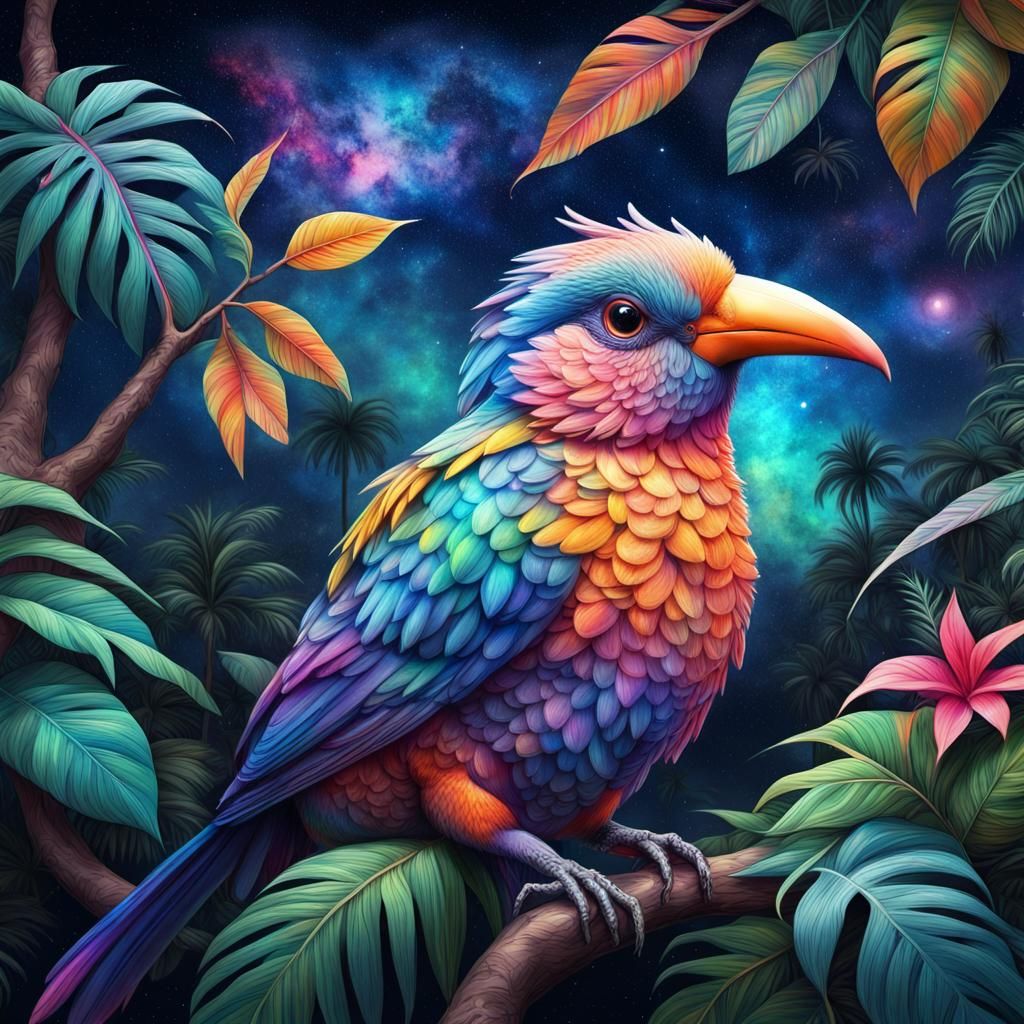A vibrant tropical bird amidst lush jungle foliage under a starry night sky. This striking image captures a holographic, cosmic illustration in mixed media.