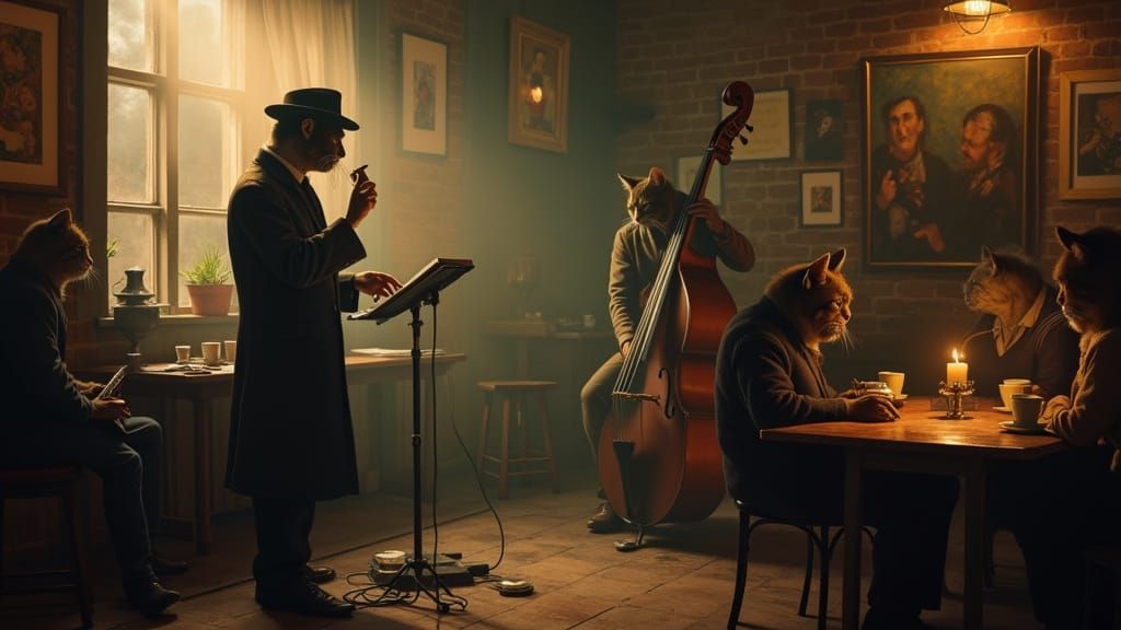 This image captures a 1950s beatnik cafe scene with anthropomorphic cats. A poet cat performs on stage while another plays bass, all under dim, smoky lighting with rich detail.