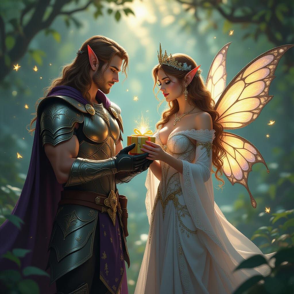 A striking picture of an elf warrior presenting a gift to a fairy queen in a magical forest. The image is rich with purples and yellows, dynamic lighting and hyperdetailed textures.