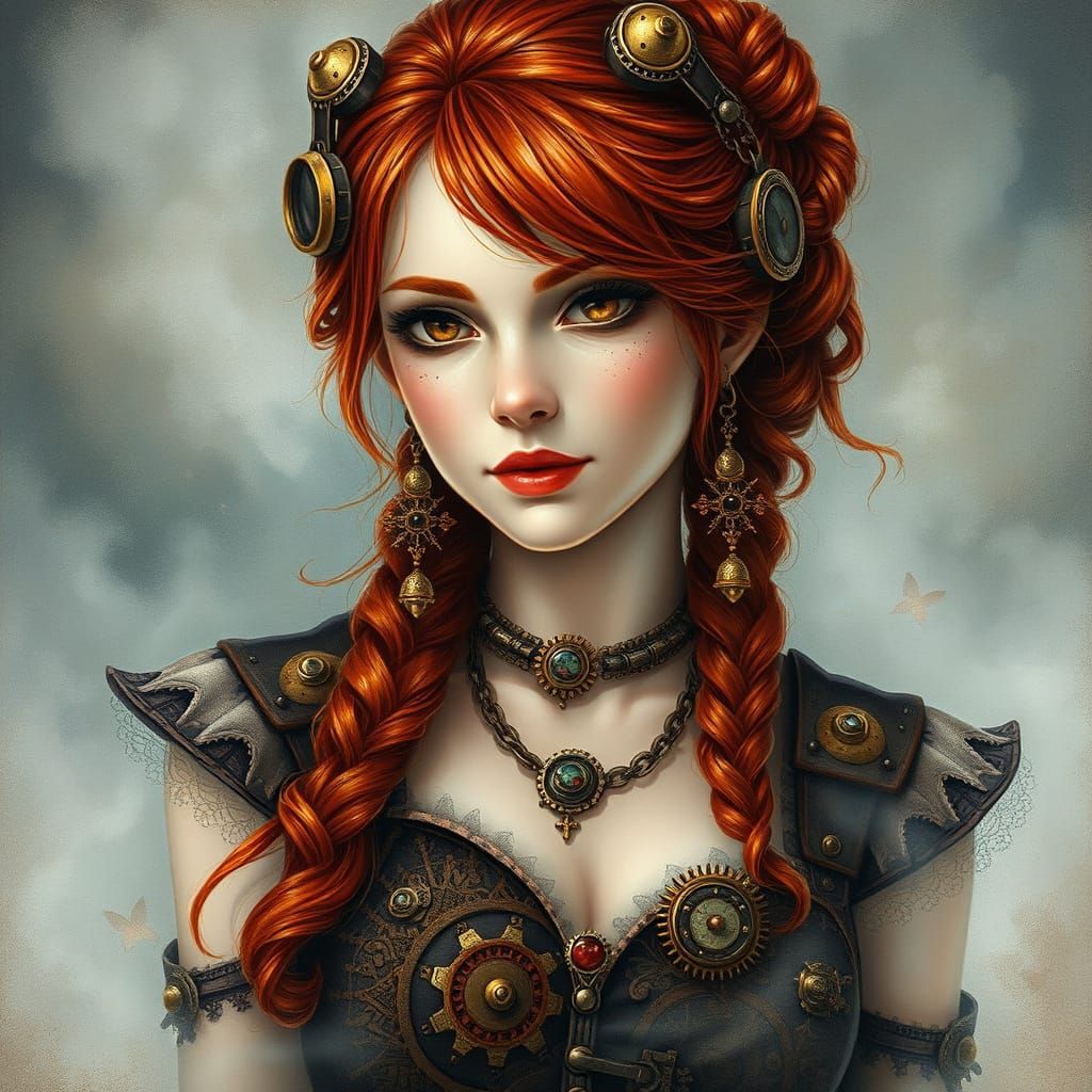 A portrait of a red-haired woman in steampunk attire with gears and copper jewelry. The image has hyperdetailed textures and a dreamy aesthetic, like reverse foil painting on glass.