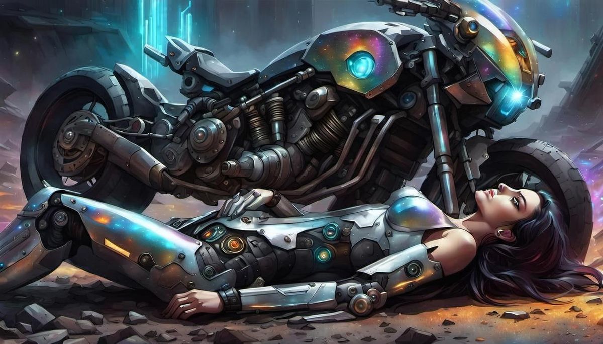 This image shows a cybernetic glove with colorful, iridescent sparkles. The detailed shimmering metal and expressive eyes are rendered with bright, dramatic lighting and silver outlines in a digital watercolor style.