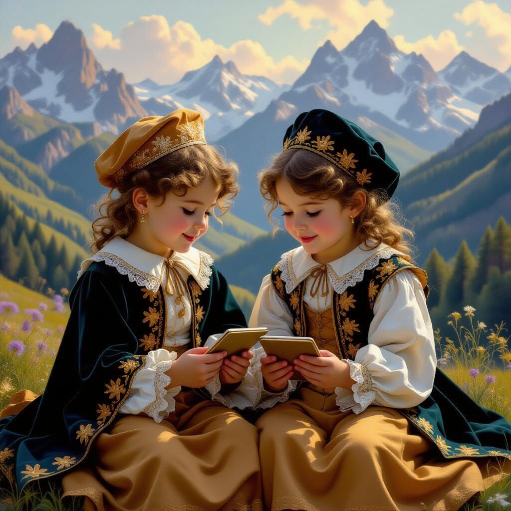 This image shows two young children in Renaissance clothing sitting together in a mountain landscape. The children, in ornate attire, smile gently as they text on a tablet in a dreamy, painterly style.