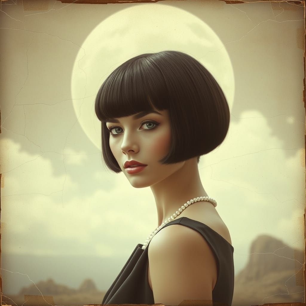 A striking picture of a vintage woman with a geometric bob haircut and thick fringe. She is dressed in elegant attire against a surreal backdrop with a muted color scheme, as double exposure photography.