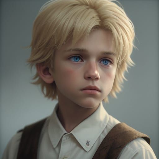 A young European boy with blond hair is captured in a cinematic film still, featuring a warm and vintage aesthetic with film grain and color grading.