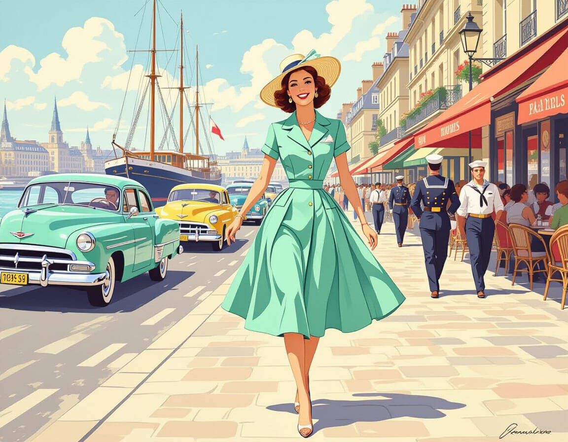 This image shows a vintage illustration of a fashionable woman in a mint dress dancing on a Paris street in springtime. Soft pastel colors enhance the nostalgic, retro atmosphere of this digital art.