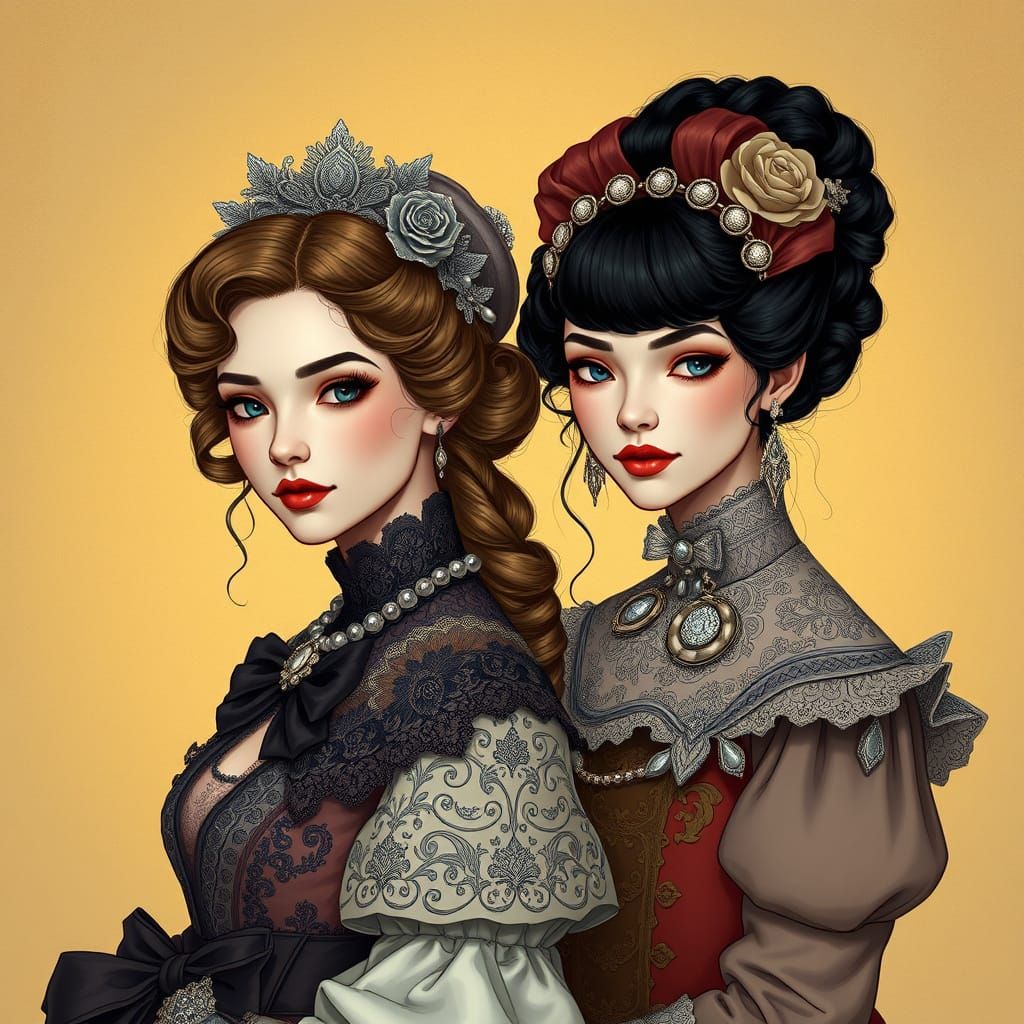 Two elegantly dressed women in Victorian attire with warm smiles, set against a golden backdrop. Features intricate lines, vibrant colors, and a mystical atmosphere.