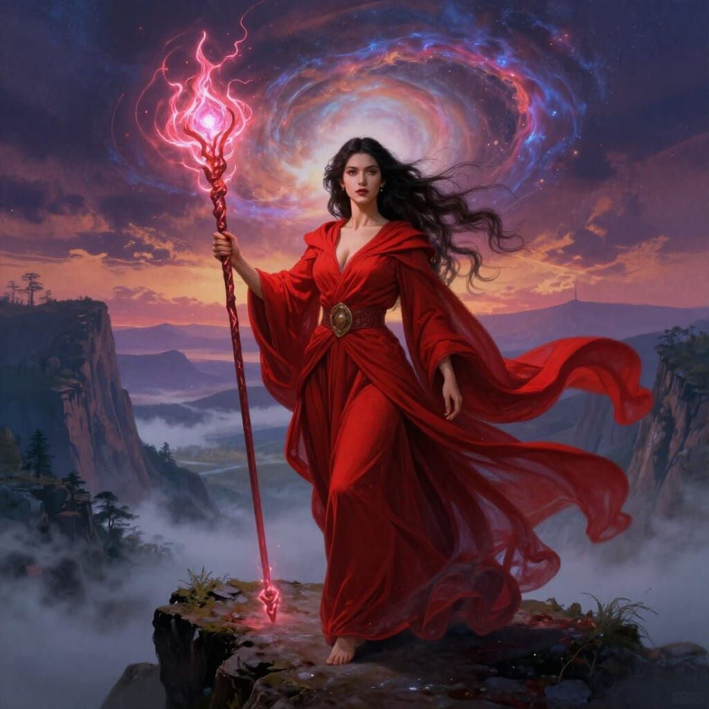 This image shows a powerful sorceress in dramatic dark fantasy art, wielding a glowing staff on a cliff overlooking a misty valley under a nebulae-filled sky.