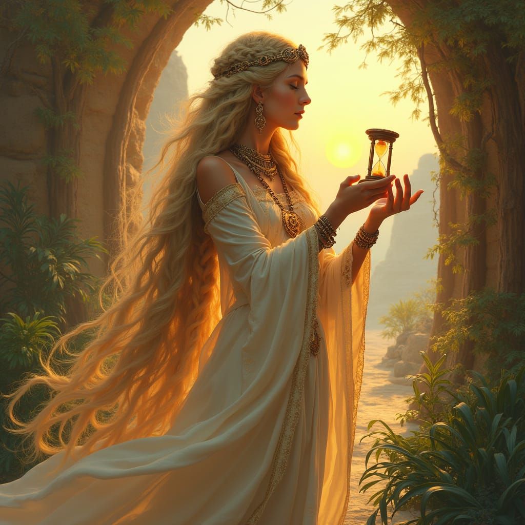 This image shows a beautiful desert witch in a mystical oasis. She wears a white and gold robe, holds an hourglass, and is surrounded by occult symbols in a dreamy, ethereal style.