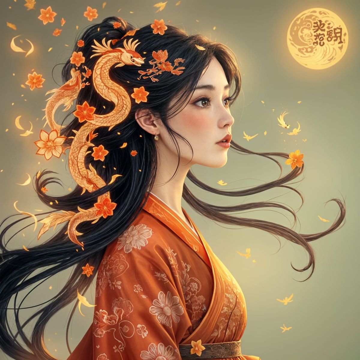 A beautiful Chinese girl is standing silently with her eyes closed, her long black hair is gently swaying in the breeze. There is a life story hidden in her hairโbeautiful dragon, red koi fish,