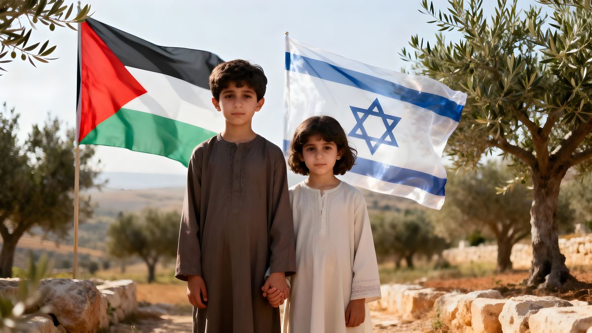 Two childrenβ€”a Palestinian child and a Jewish childβ€”stand side by side, gently holding hands at the center of the frame. Their expressions are calm and hopeful. Behind them, the Palestinian flag and the Israeli flag appear softly in the background, lightly waving or subtly blended into the sky like translucent ...