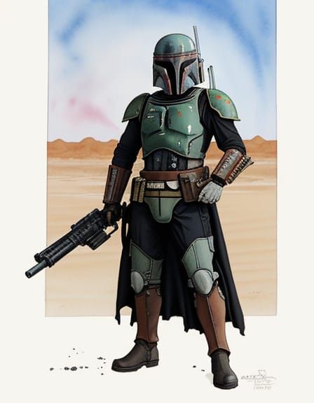 A cartoon of Boba Fett holding a blaster on a desert moon. In the background is a crashed spaceship. The image has a watercolor and gouache aesthetic.
