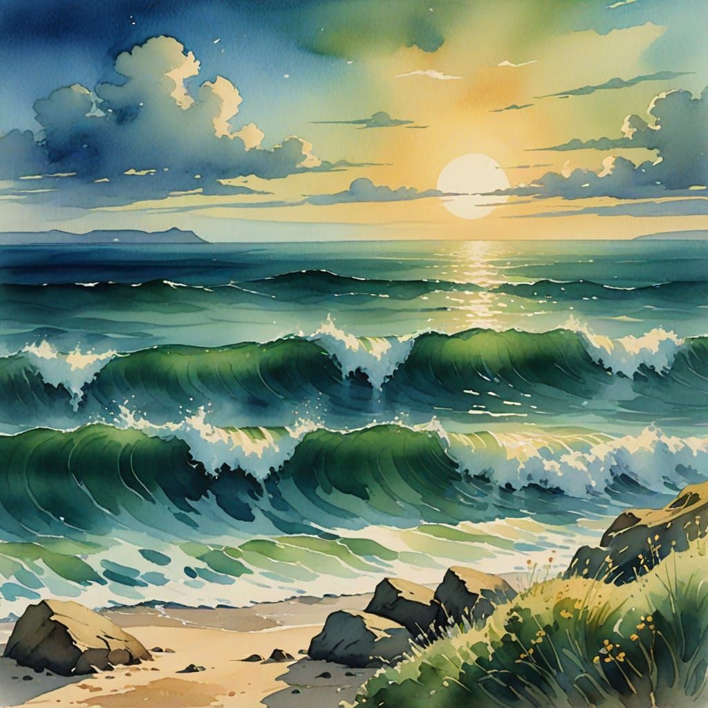 A watercolor painting of Percy Bysshe Shelley writing poetry by the ocean. Soft brushstrokes and gentle waves create a dreamy, ethereal scene with vibrant blue and green hues and warm golden lighting.