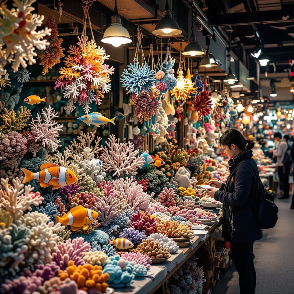 This image depicts a busy marketplace selling decorative items made from coral and marine animals, rendered in a hyperrealistic style with rich colors and diffused lighting.