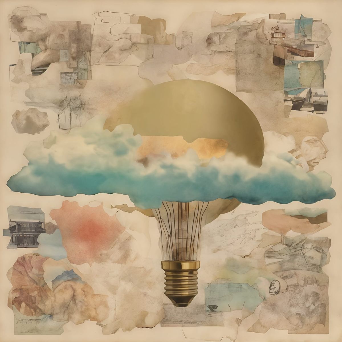 Collage art. intellectual dialogue over Artificial Intelligence Medical drawings and mismatched vintage postcards and torn paper scraps, pastel-colored sky. Collage art. Brass knob, emitting a soft, inviting glow. A single, stylized cloud drifts by. Nostalgic, vintage ephemera,