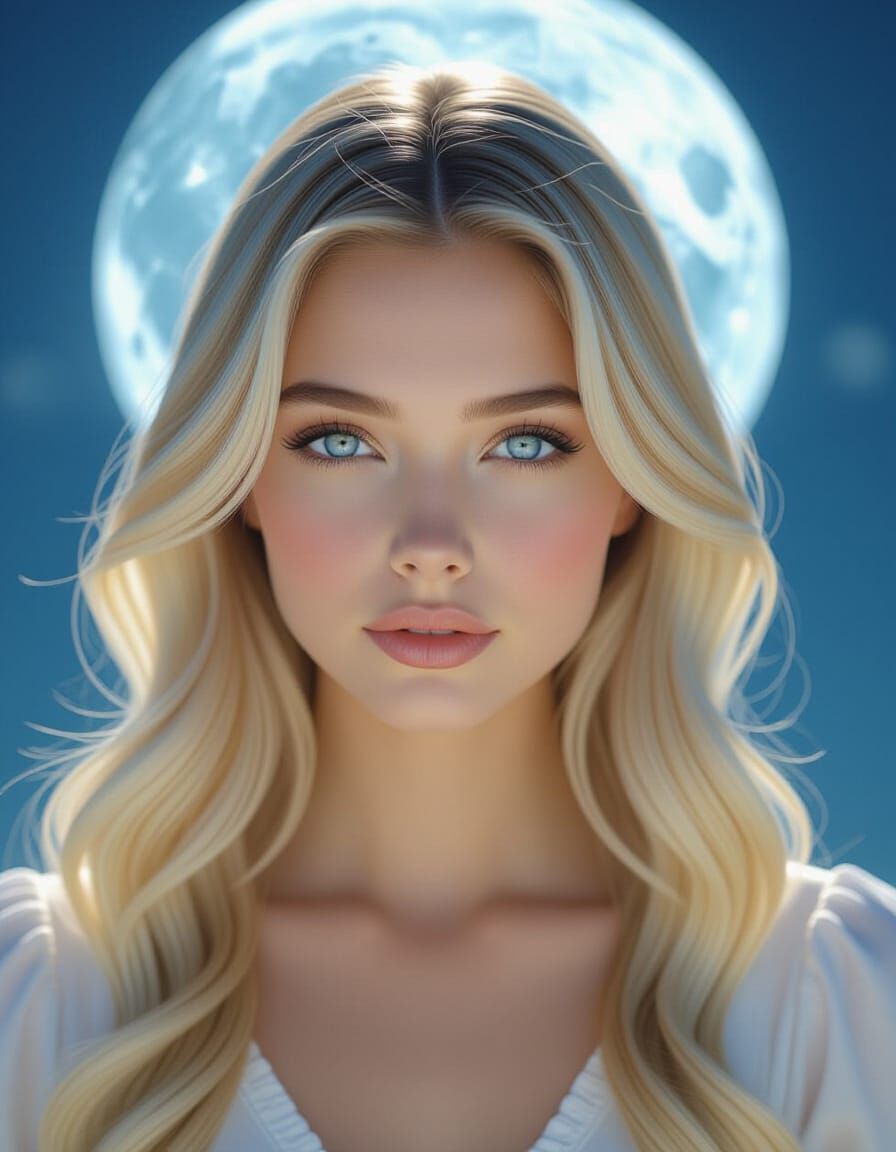 This image shows a beautiful young woman with long blonde hair and glowing blue eyes, bathed in moonlight. A photorealistic and detailed digital painting with a cinematic and dramatic atmosphere.
