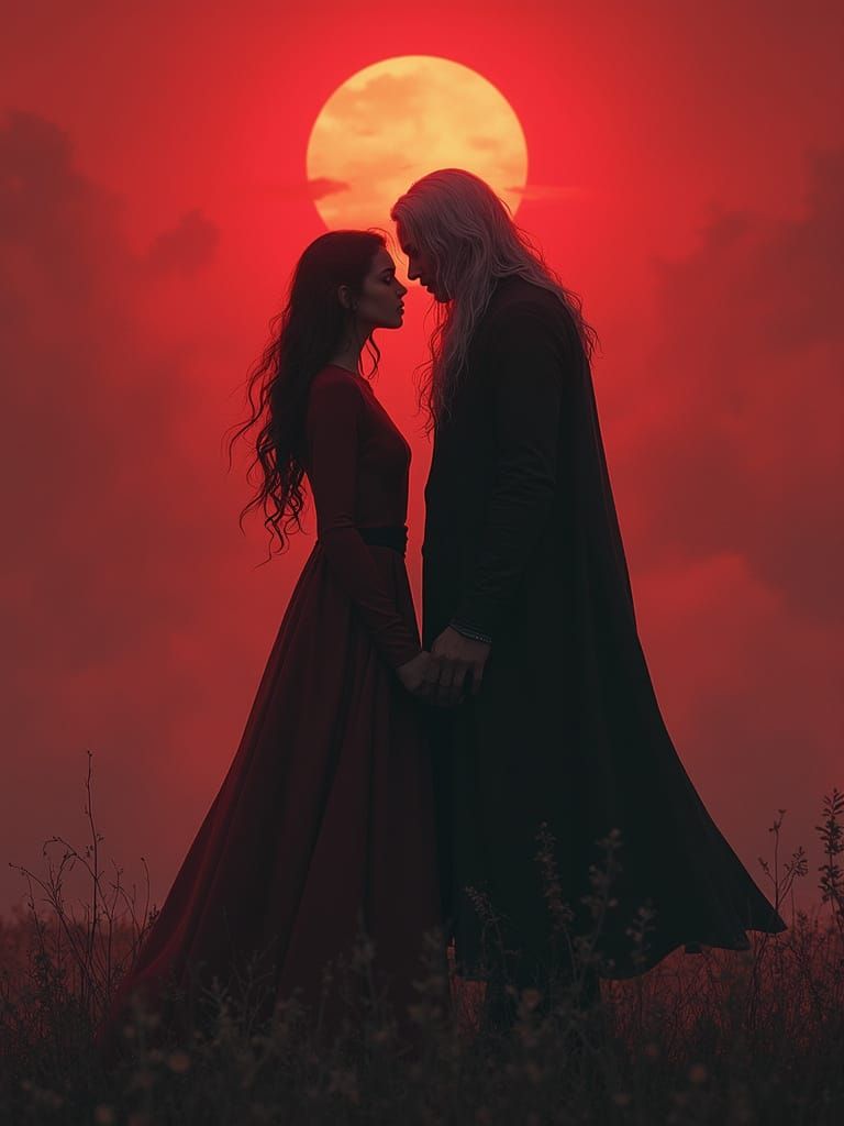A striking picture of three figures at dawn, bathed in red light and cloaked in shadows. The scene evokes a cinematic, dystopian fantasy aesthetic with intricate details and muted colors.