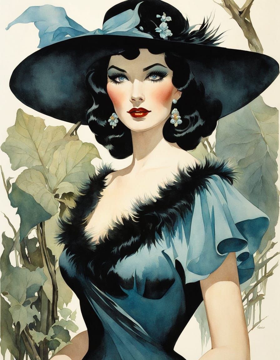 This image is a watercolor illustration of a beautiful swamp witch with black hair and ice blue eyes, depicted in a detailed, retro impressionist style.