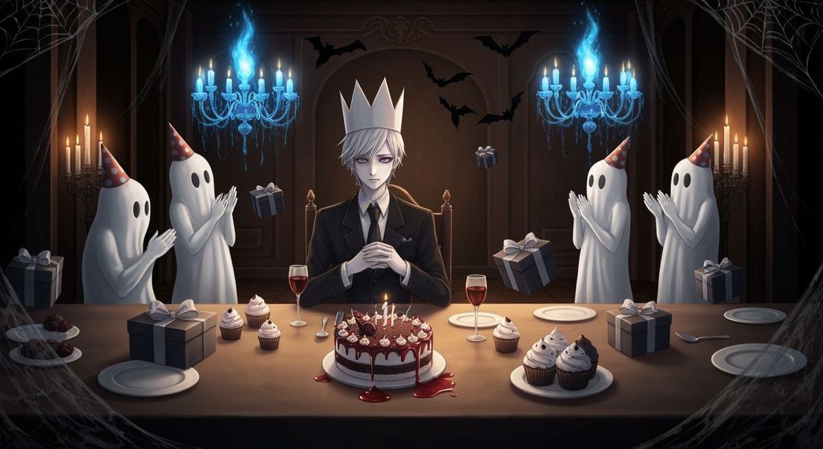 Anime-style illustration of a grand, candlelit ballroom where cobwebs hang like tinsel. A long table filled with eerie birthday treats — bla...