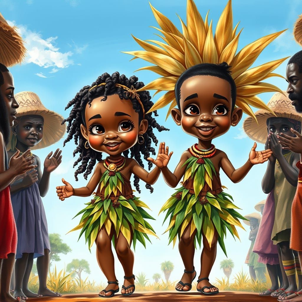 This image showcases a stylized, hyper-realistic scene of African toddlers dancing in a vibrant village surrounded by applauding villagers. Created in a glossy, airbrushed Prisma art style with detailed textures and vibrant colors.