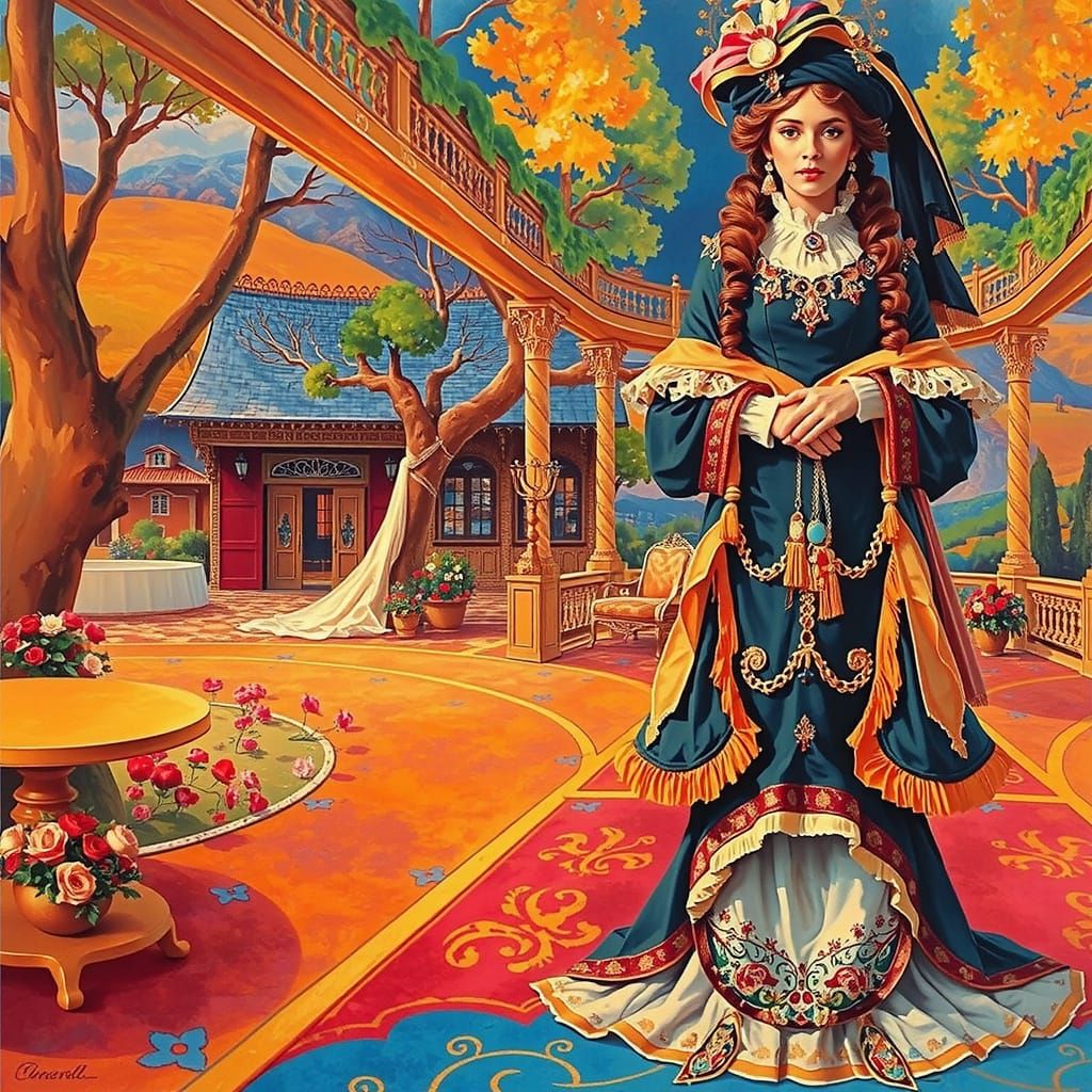 A captivating photorealistic image of a figure in vintage clothing in a French countryside. The soft, golden light and intricate details evoke a romantic, idyllic scene.