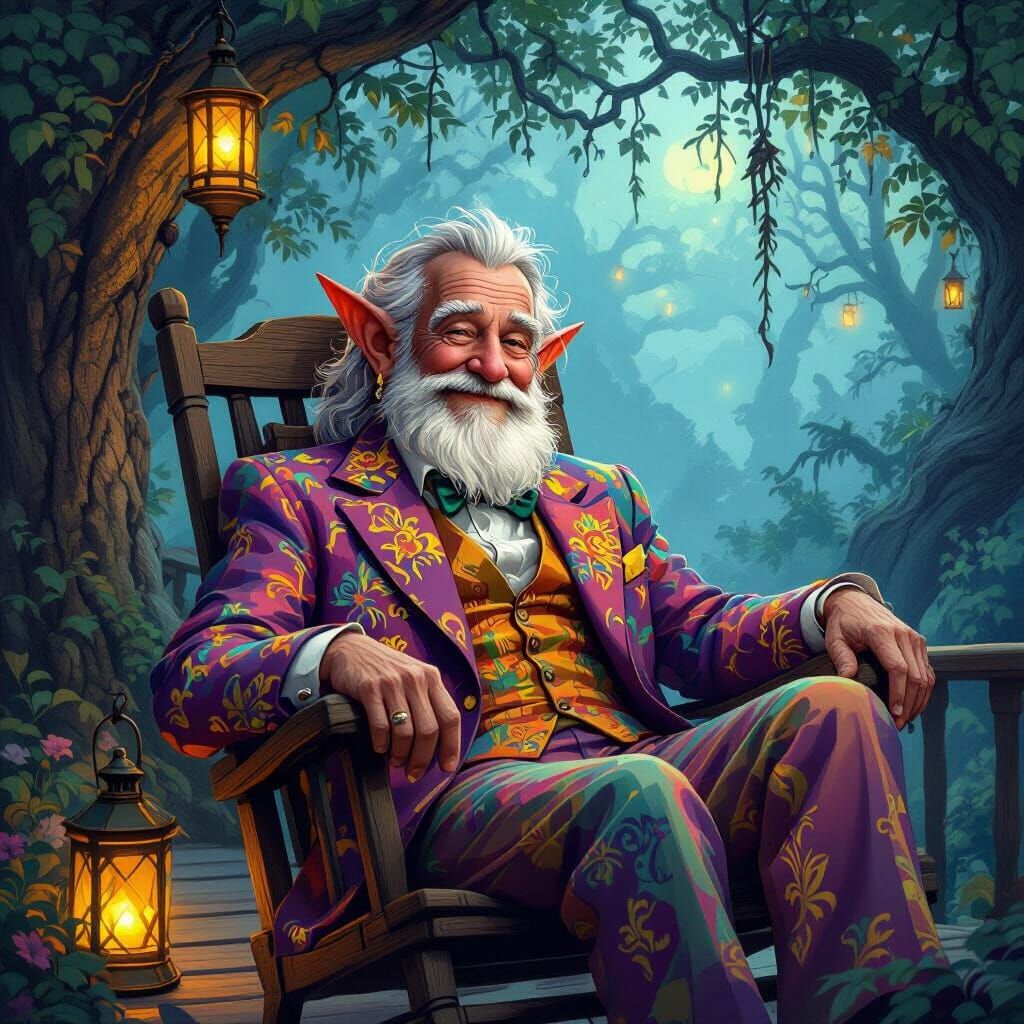 This image shows a friendly, kindly old southern wood elf in a colorful New Orleans suit, sitting on a treehouse platform. The scene features a mystical twilight forest, rendered in a detailed fantasy concept art style.