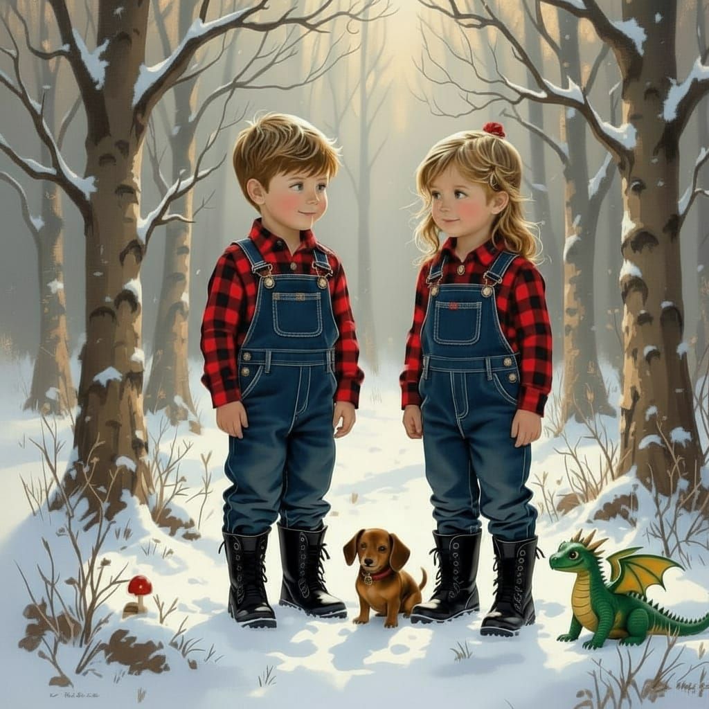 This image shows twin siblings in a miniature forest. They wear boots, overalls, and checkered shirts, finding a small dachshund and dragon in the snow.