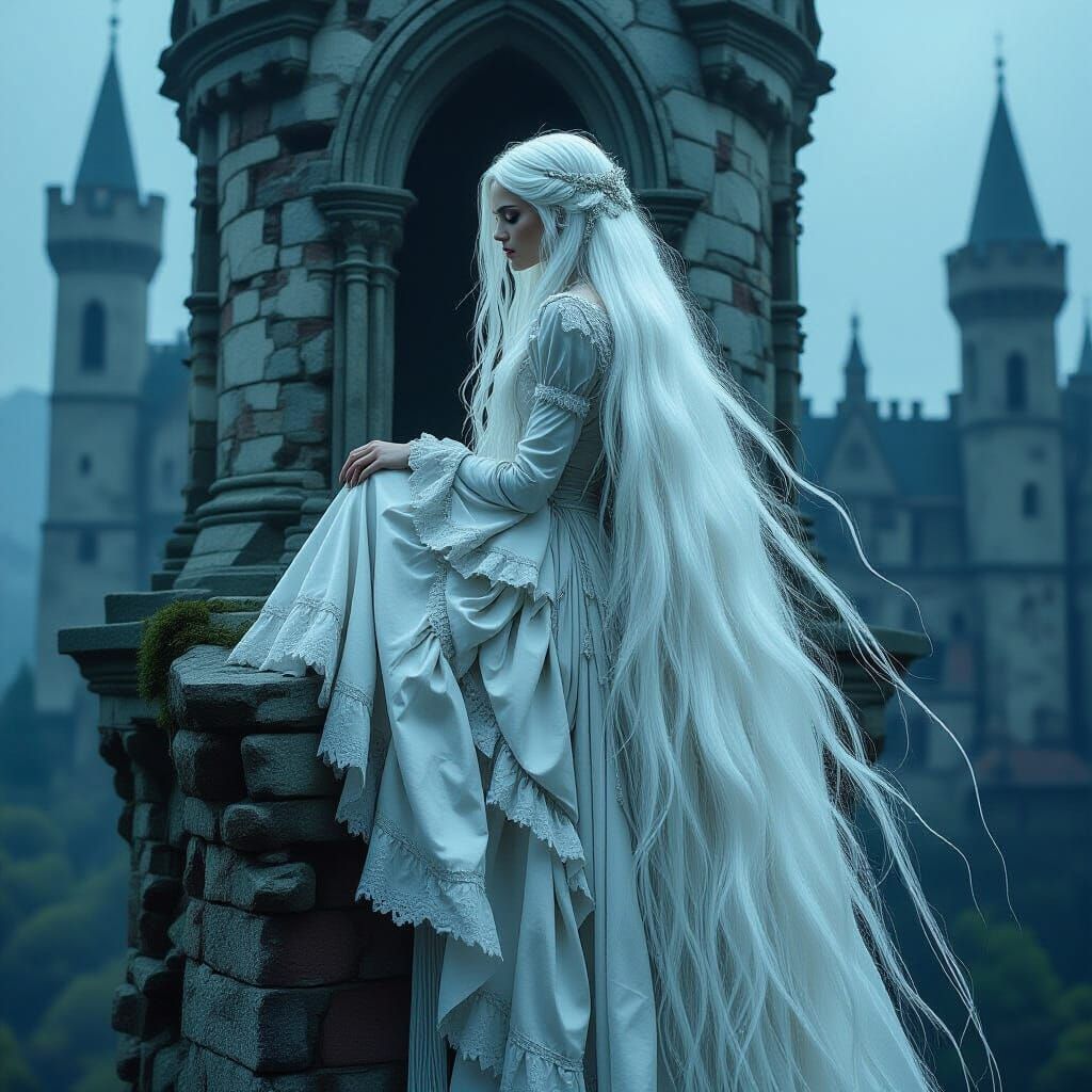 This image shows a woman with long white hair cascading down a crumbling Gothic tower. She is dressed in Victorian attire, and her hair is braided with silver threads, creating an eerie atmosphere in a digital art style.