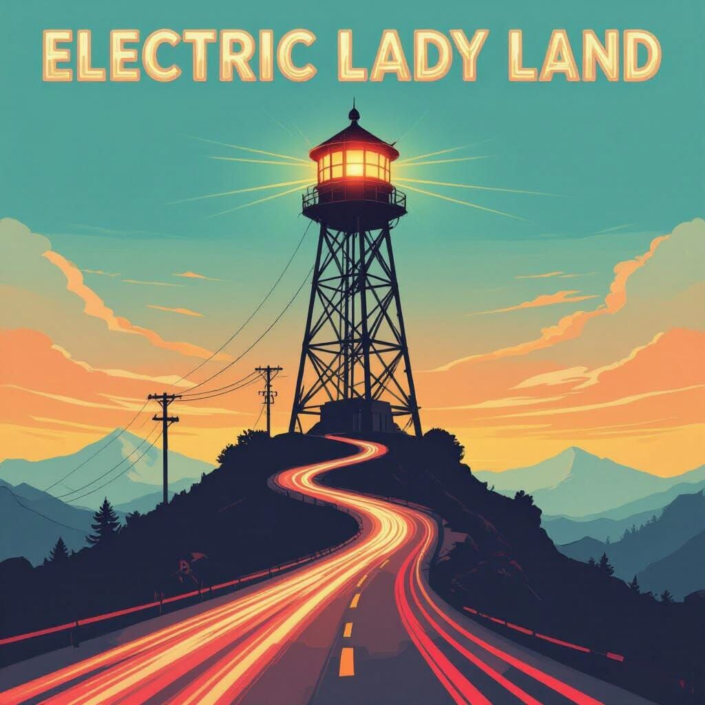 A digital rendering of a watchtower at a mountain top crossroads, reminiscent of psychedelic album art. The image blends natural landscapes with surreal, electric elements.