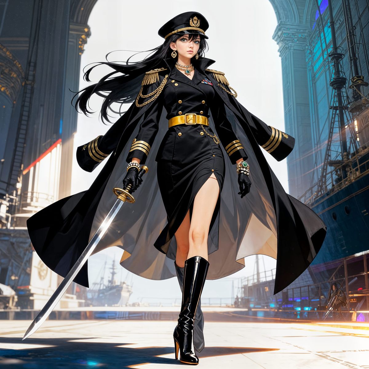 This anime-style image features a young female admiral in a black navy uniform, complete with a sword, green eyes, and elegant attire. She wears a coat, high-heeled boots, gloves, and a golden belt.
