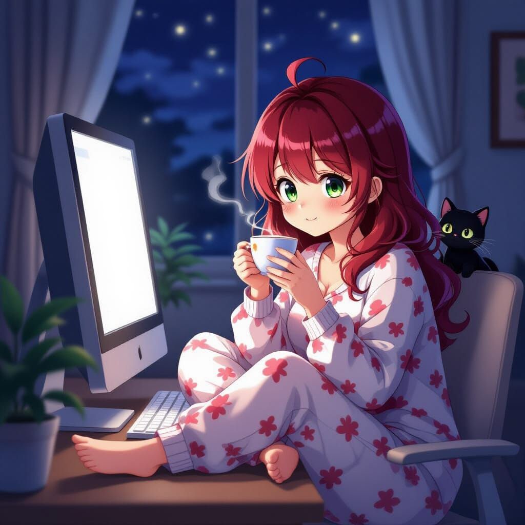 This image shows a detailed anime illustration of a curvy woman in pajamas drinking tea while a kitten watches from a computer monitor. Features cinematic lighting and vibrant colors.