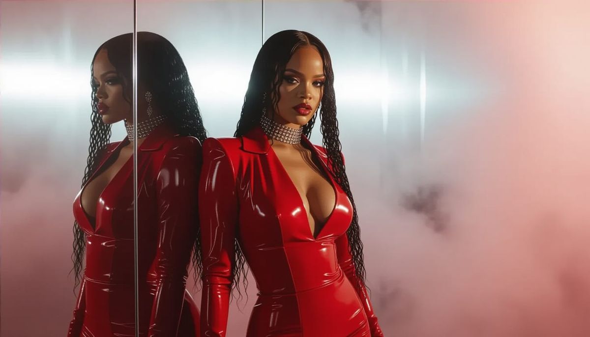 A photorealistic image of Rihanna in a striking red latex and silk outfit, leaning against a chrome wall with abstract reflections. Cinematic lighting and atmospheric smoke enhance the mood.