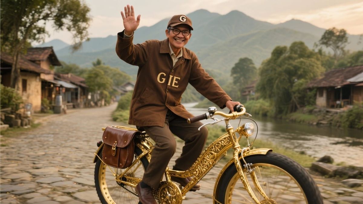 A hyperrealistic film still captures a smiling 50s Indonesian man wearing glasses and a G-logo cap, waving from a gold-plated bicycle. Features atmospheric lighting and film grain.