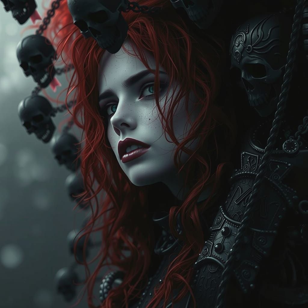 This image depicts a mysterious woman with wild crimson hair and dark lipstick, blending seamlessly with black skulls in a surreal, cinematic scene. Dominated by deep reds and blacks, the haunting atmosphere evokes a sense of foreboding and unease.