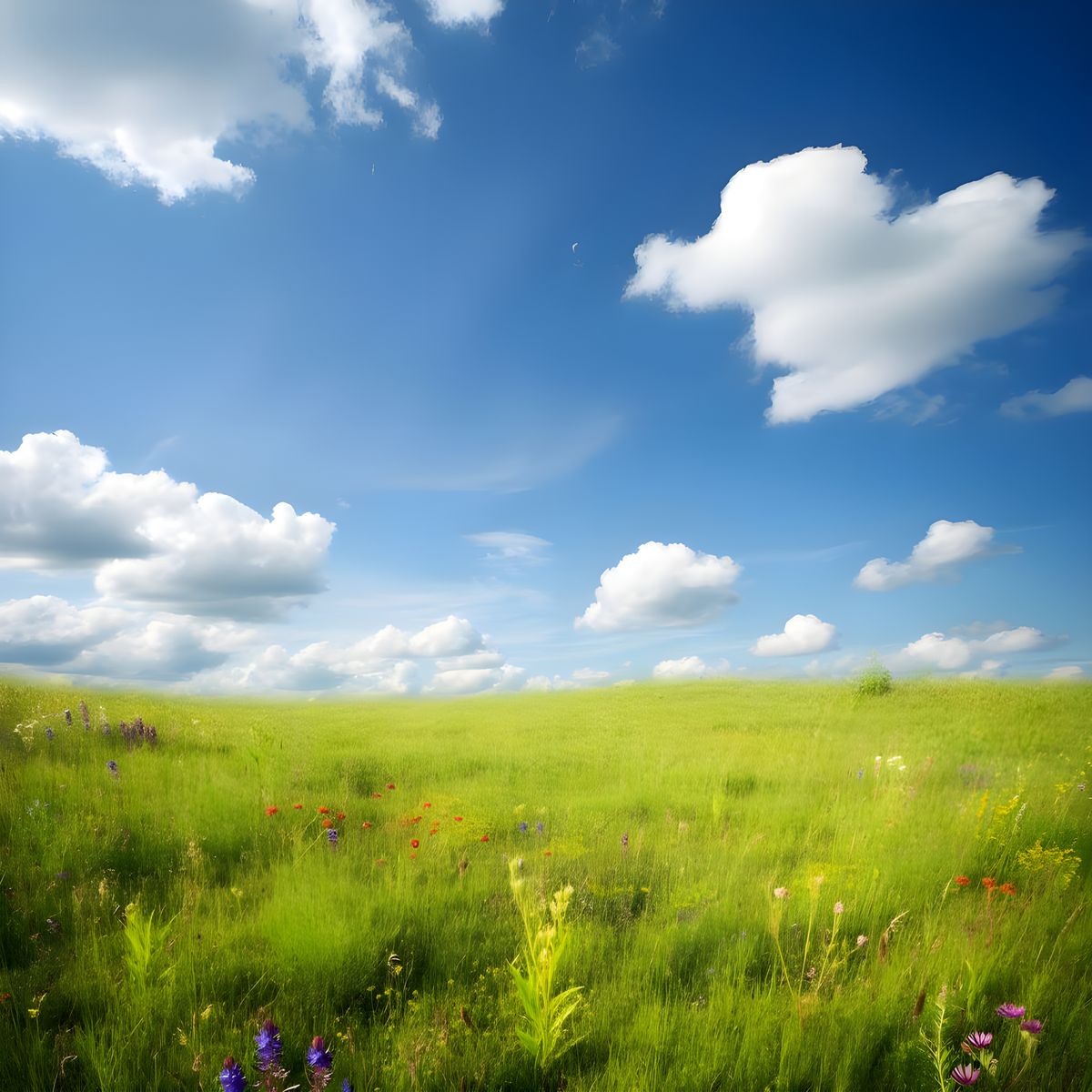 This image depicts a serene and idyllic scene of lush green grass and a bright blue sky, evoking a sense of warmth and tranquility.