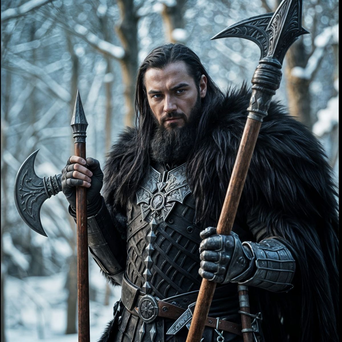 A high-detail, cinematic image of a fantasy warchief in dark armor and a wolf cloak, holding a spear and axe in a scenic winter forest. Masterfully lit for dramatic effect.
