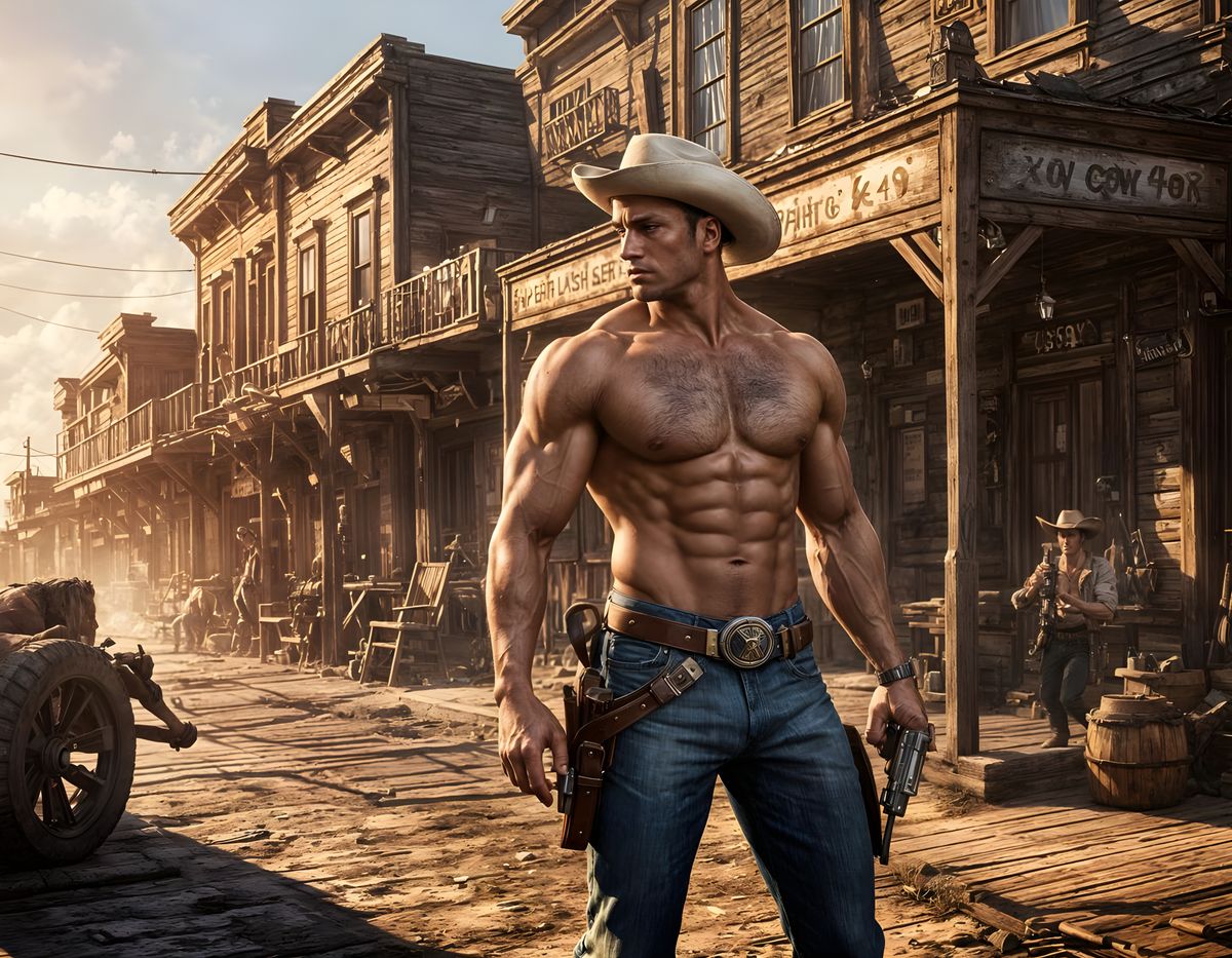 A striking image of a muscular outlaw cowboy shooting his revolver in a vibrant Old West town at sunset, surrounded by detailed matte painting and fantastical elements.