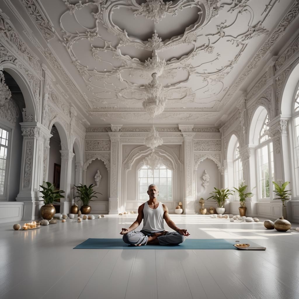 A 3D rendered image of a zen yoga room interior with white accents. The composition, shot in portrait mode, features a cinematic, detailed and atmospheric digital matte painting.
