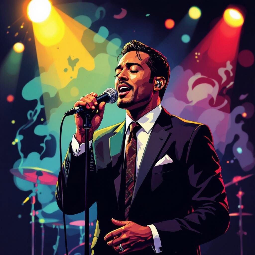 A vibrant pop art portrait of a jazz musician singing in a smoky club. The artwork features bold geometric shapes, vibrant colors, and a screen print texture in a WPAP aesthetic.