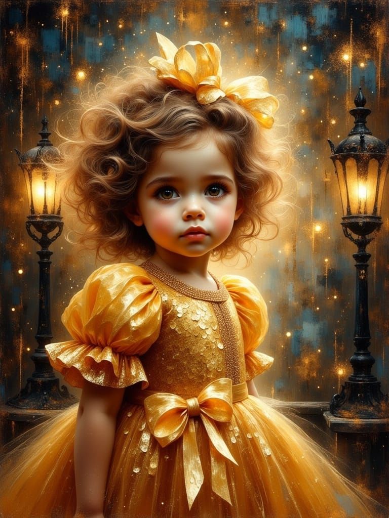 This image depicts a charming toddler girl in a golden gown within a Victorian gazebo at dawn. Created with thick, textured oil paint effects, it evokes a Baroque and Pre-Raphaelite aesthetic with glowing lanterns.